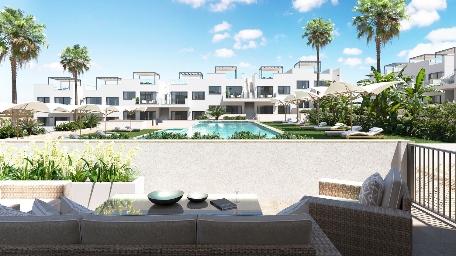 Opvallend bij deze Penthouses is de ruime living met open keuken, inclusief apparatuur, welke in de breedte is gebouwd en daardoor veel lichtinval heeft mede door de schuifpui en het grote raam. Voorzien van 2 slaapkamers en 2 vloer verwarmde badkamers waarvan 1 en suite. Het woonoppervlak is 69 m2. Het balkon grenzend aan de living is 8 m2 en het balkon aan de slaapkamer aan de achterzijde is 3 m2. Het 66 m2 grootte solarium met pergola, is een fantastisch zonneterras met prachtig uitzicht over de Salinas van Torrevieja. De gemeenschappelijke tuin heeft een schitterende infinity pool van 25 x 7 meter met jacuzzi en een kinderzwembad van 25 x 3 meter, een heerlijke zonneweide en speeltoestellen voor de kinderen. Een ondergrondse parking met storage room is een optie. Verlichting binnen en buiten en airconditioning is inclusief.