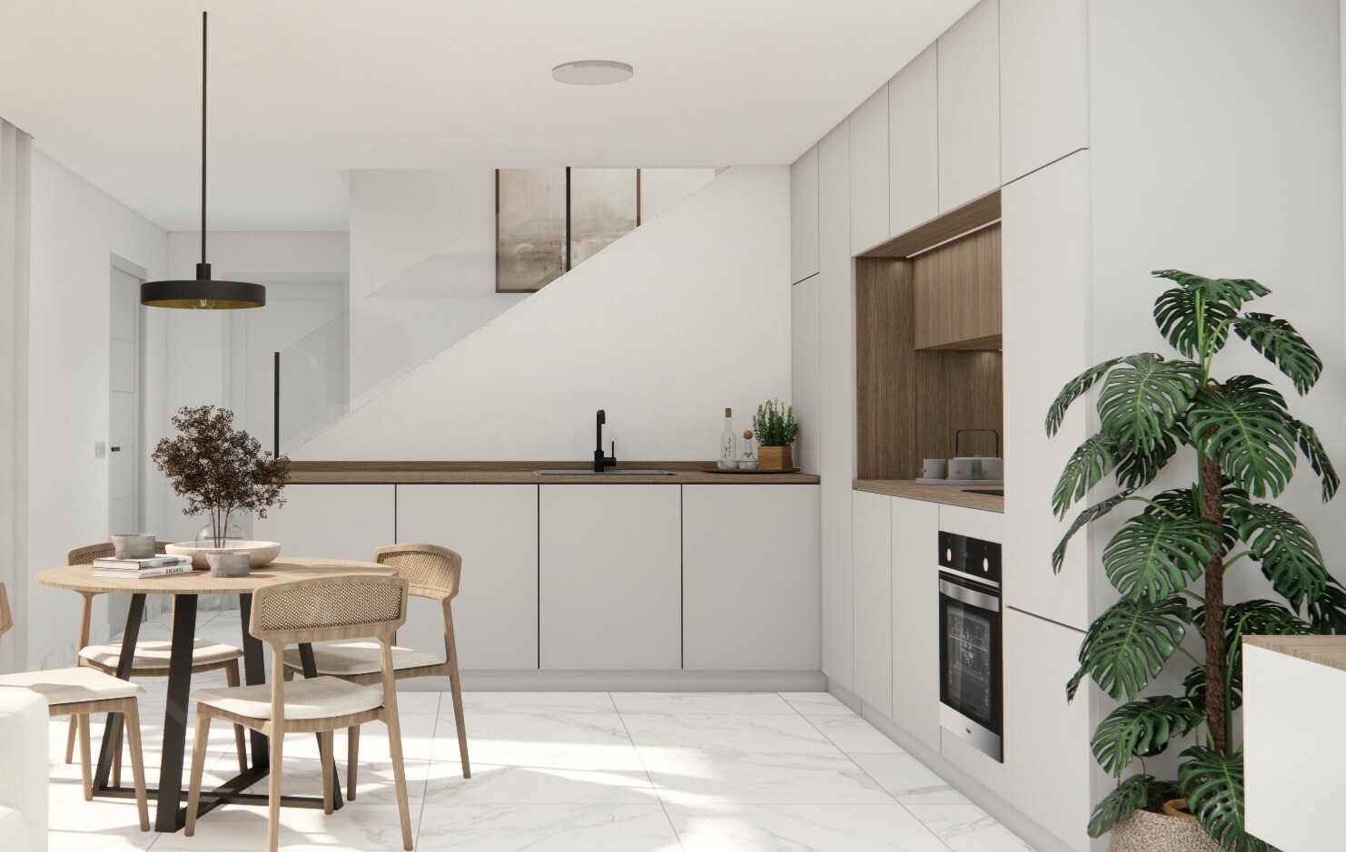 Deze 2 onder 1 kap van 90 m2 in mooie lichte kleurschakeringen en een leuke hoekkeuken inclusief keukenapparatuur zijn voorzien van 3 slaapkamers en 2 badkamers. 1 slaapkamer en 1 badkamer en suite op de begane grond, 2 slaapkamers met beide aangrenzend een ruim balkon, bevinden zich op de 1e verdieping. De 2e badkamer is eveneens op de 1e verdieping en heeft een extra grote dubbele wastafel. Zowel de badkamer op de begane grond als op de 1e verdieping heeft vloerverwarming.Pre-installatie voor airco en pre-installatie van een oplaadpunt voor de auto zijn inclusief. De woningen hebben allen een oprit met elektrische poort. Als optie is er de mogelijkheid voor een solarium. De tuin aan de voor- en zijkant is volledig aangelegd, inclusief zwembad en deels met kunstgras en deels met terrastegels.