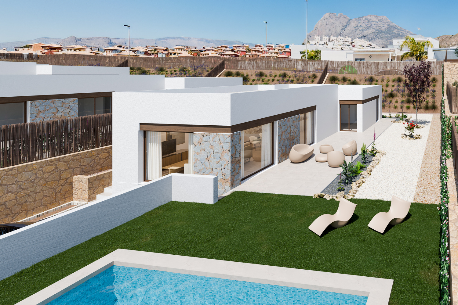 Golf & surfparadijs op droomlocatie met vrijstaande gelijkvloerse Mediterrane / Ibiza stijl Villa’s met 3 slaapkamers in Murcia